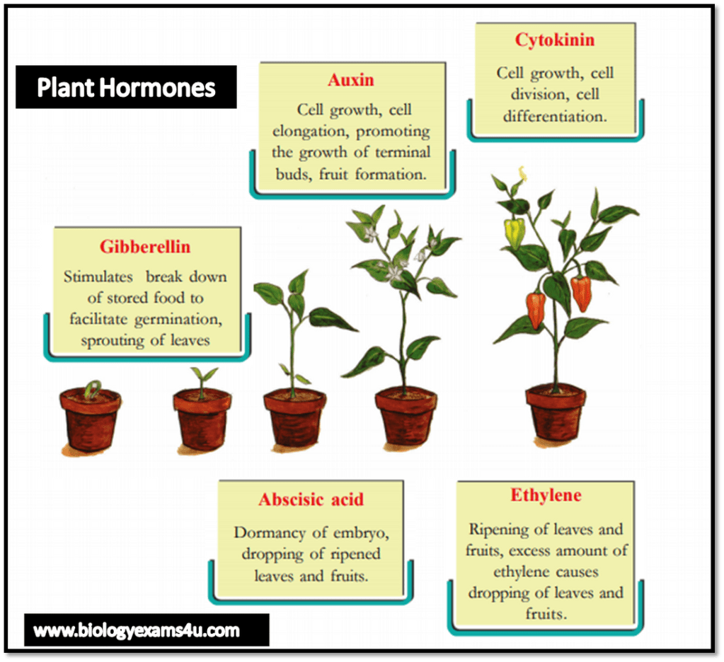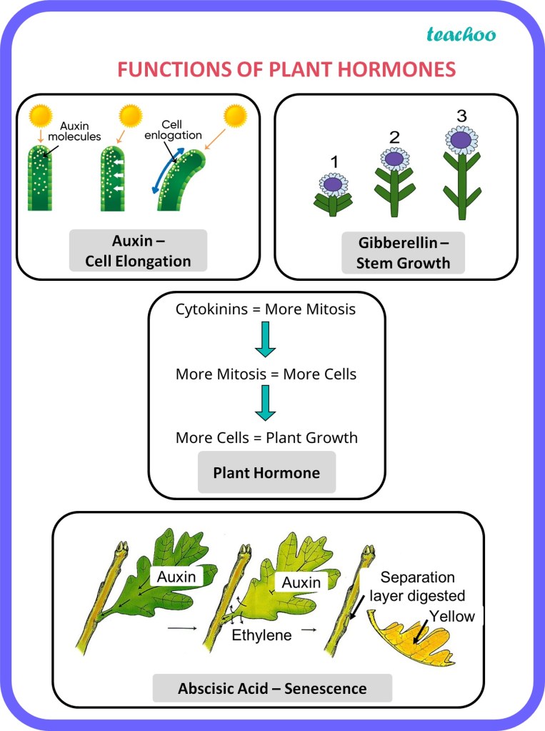 - Auxins: Auxins are primarily responsible for regulating cell elongation, apical dominance, and root initiation. They control tropisms, such as phototropism (bending towards light) and gravitropism (response to gravity).